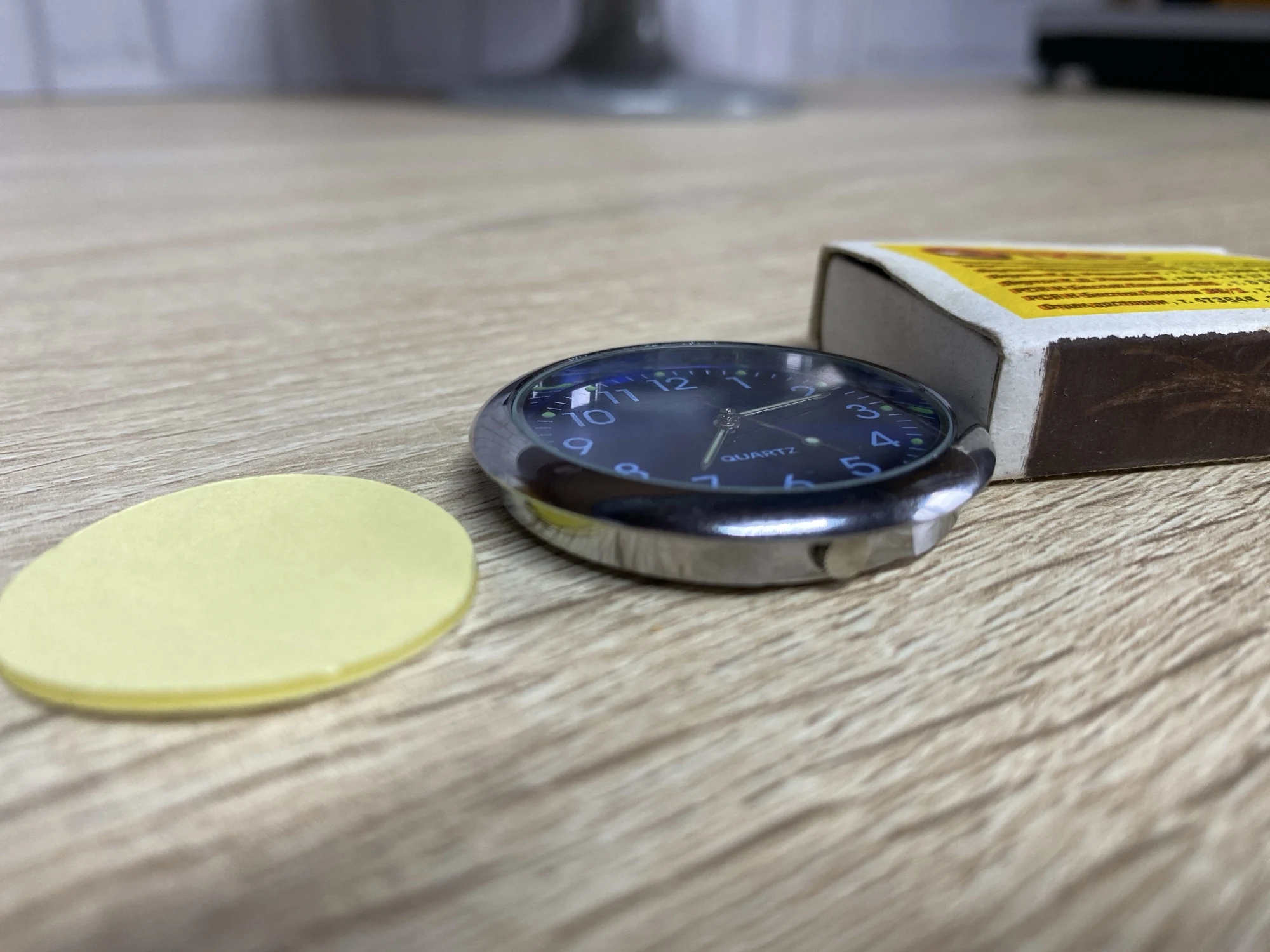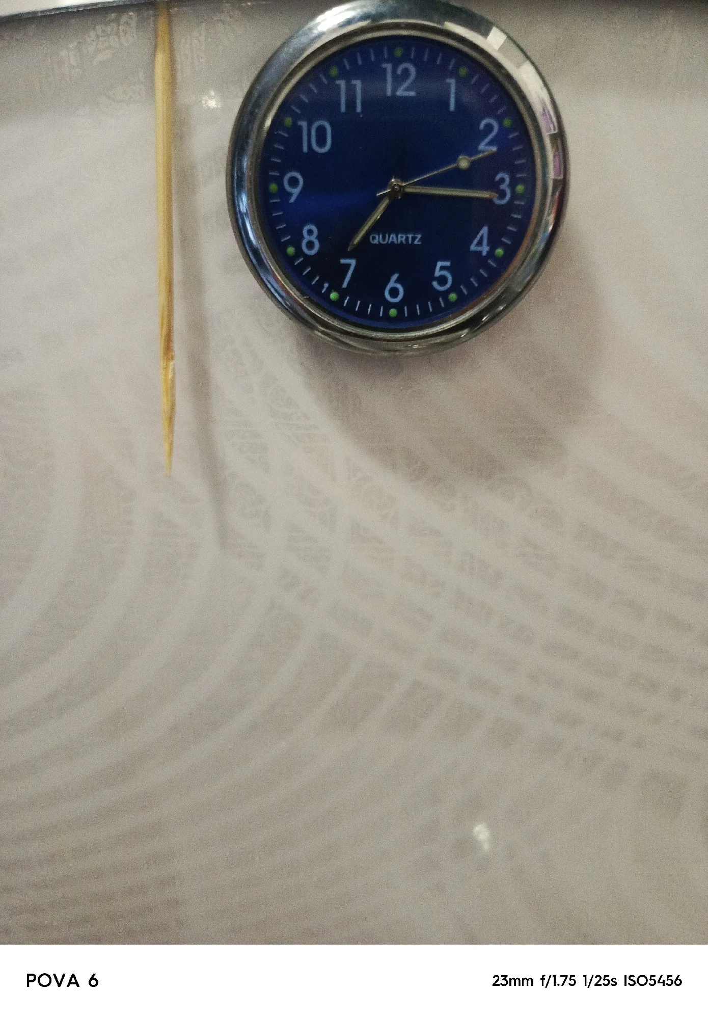 regular wristwatch, looks larger in size in the photo. In the photo next to it is a regular toothpick.
